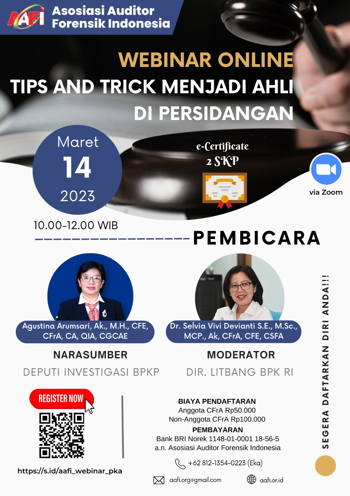 Asosiasi Forensik Auditor Indonesia (AAFI WILEWAK) mengundang Bapak/Ibu dalam Webinar Online dengan Tema "TIPS AND TRICKS MENJADI AHLI DI PERSIDANGAN"