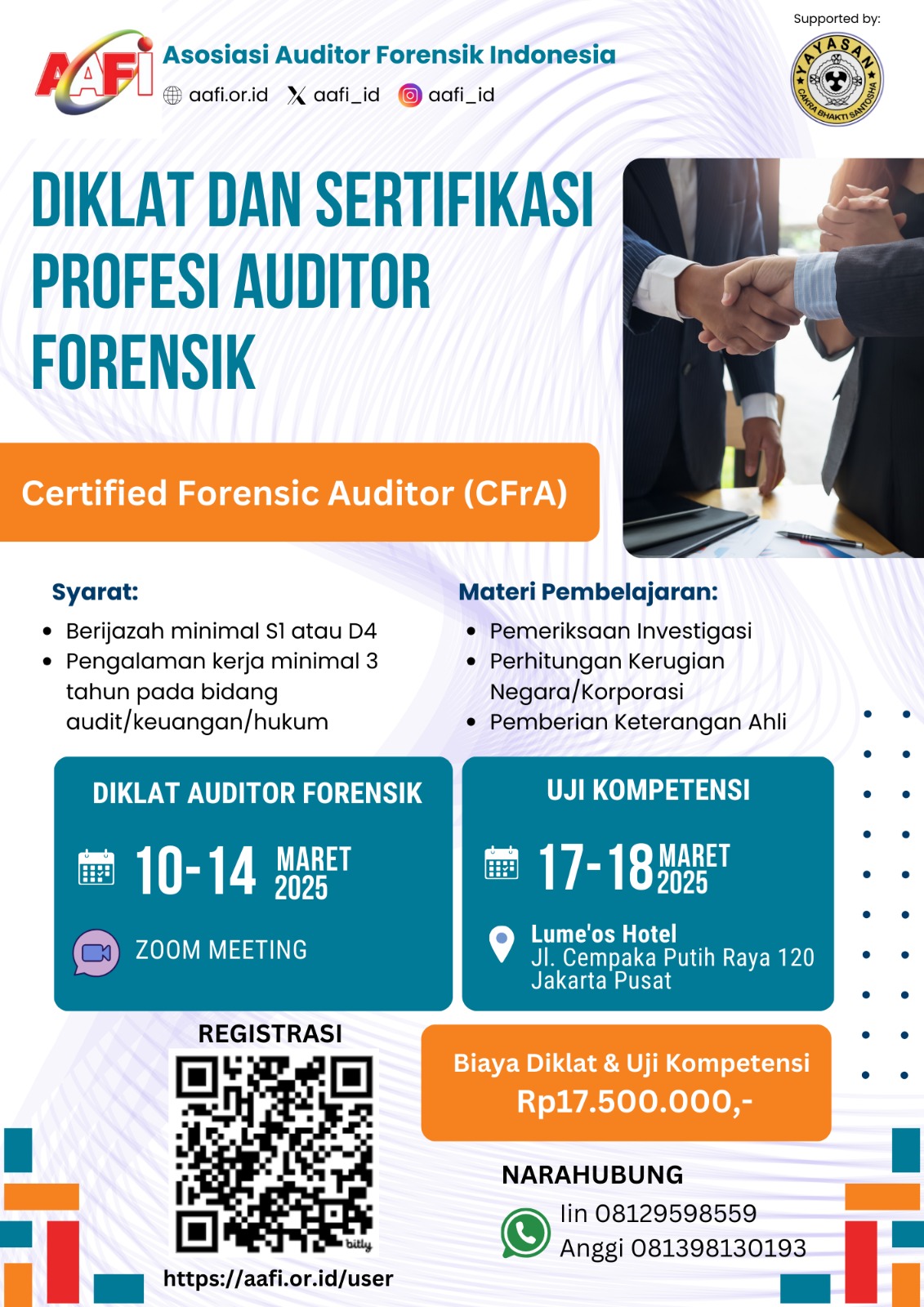 Asosiasi Auditor Forensik Indonesia Wilewak (AAFI WILEWAK), dengan dukungan dari Yayasan Cakra Bhakti Santosha, kembali mengadakan Diklat dan Sertifikasi Profesi Auditor Forensik dengan gelar Certified Forensic Auditor (CFrA). Program ini bertujuan untuk meningkatkan kompetensi para auditor dalam bidang audit investigatif dan forensik guna mendukung upaya pemberantasan tindak pidana keuangan dan korupsi.